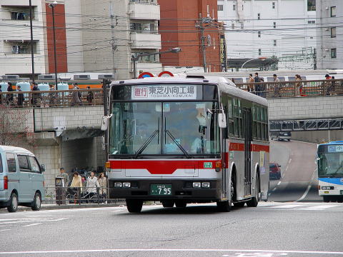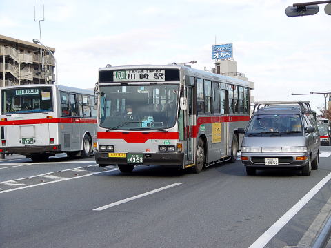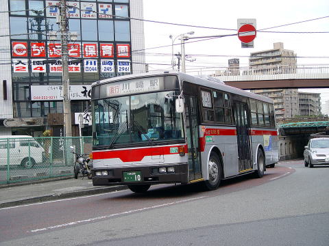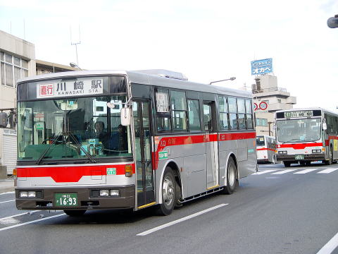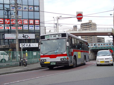 ソリッドスクエア前ですが、朝の撮影のため陸橋の上には多くの人が往来しています。車内も満載で走行しています。車両は、川崎営業所で一生涯を終えたKA913です。 |