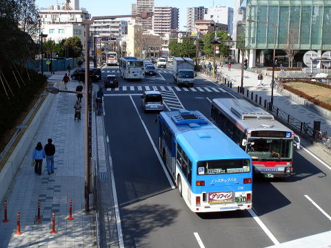 ソリッドスクエア前での川崎市営バスと東急バスのすれ違い。 |