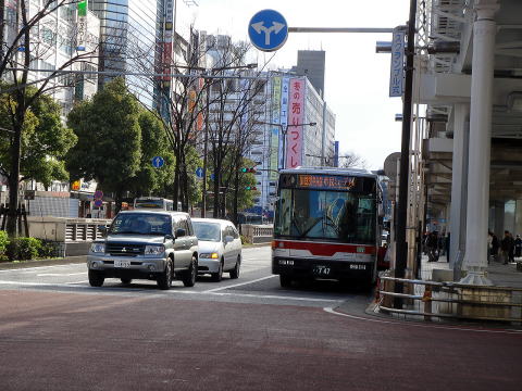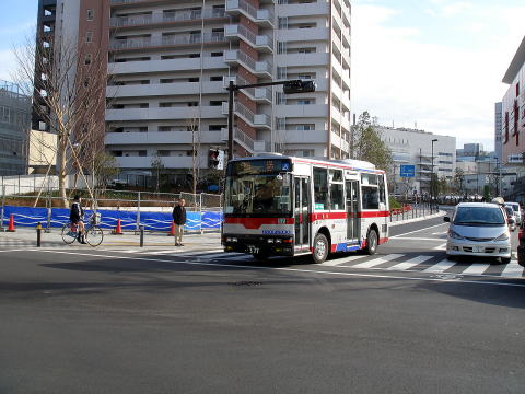 ラゾーナ前の交差点を左折するKA575。川崎市営バスの一部の路線は、お先にこちらに営業運転でやってきています。 |