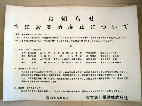 中延営業所廃止のお知らせ(昭和56年のもの) K1655さまより画像提供いただきました。誠にありがとうございます。 |