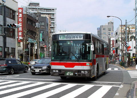 バス停名である田園調布郵便局は、画像右手後ろの交差点角に、田園調布警察は、画像左手手前の交差点の角にあります。バス停は、警察署の少し先にあります。 |