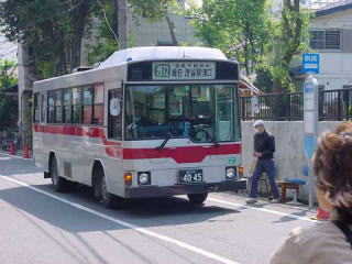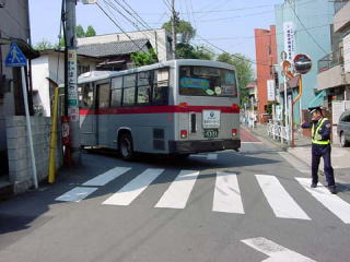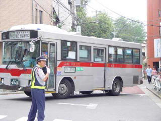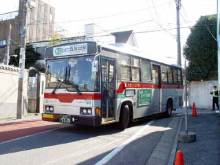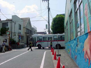 渋谷方面の終点は、スイミングスクールの前にある臨時バス停です。これから五反田行きに折り返すためバックで進入します。うしろでは誘導員さんが誘導を行っています。