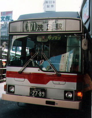 お馴染みの渋谷駅東口52番ポールに停車中の渋71。渋71も渋72同様、かつては東急文化会館側(いまは解体されています)にバス停がありました。 画像は、昭和58年に渋71が中型車化された際に導入された先代の500番台です。11両導入されましたが、当時は冷房車の導入が目黒営業所ではこの形式のみで大型車さえすべて非冷房でしたので、やってくるとうれしくなったものです。画像の左奥に写っているのは渋70で、東口バスターミナルはにぎやかな時代です。 |