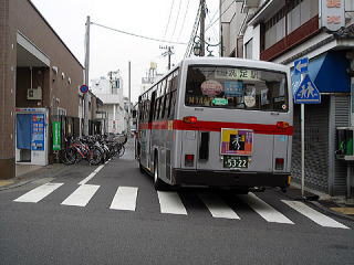 右折後は、すぐにまた左折しバス停に到着です。駅横の駐輪スペースがあるため道幅が狭くなっています。 |