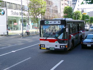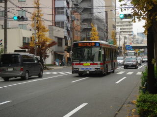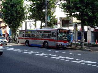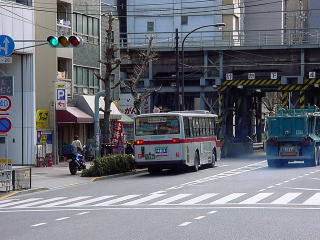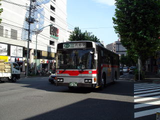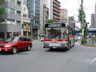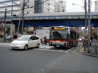 不動前駅入口から渋谷へ向かう渋41。画像右を曲がると「かむろ坂」になります。かつて、渋72が大型車の時代、桐が谷付近が両通でなかったため五反田ゆきは西五反田四丁目からこのかむろ坂を通過して山手通りへ抜けていました。 |