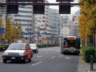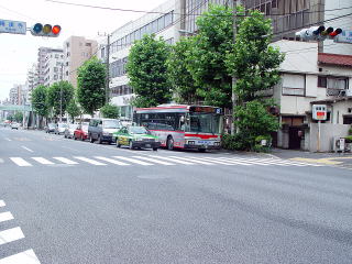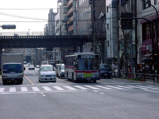 渋谷方面のバス停付近の風景です。すぐ後には大崎広小路がみえます。 |