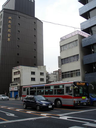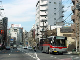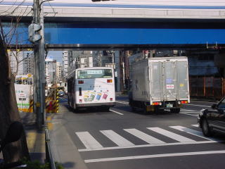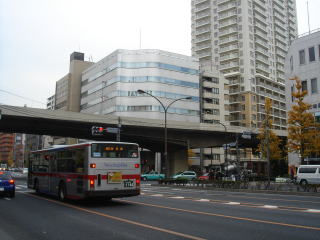| バス停名の大崎郵便局は、画像右手の白い建物です。このあたりも高層マンションが立ち並び風景がかわりつつあります。 |