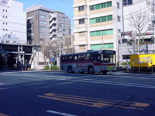 | 大井町方向のバス停の風景です。かつては、ここ止まりの大崎広小路ゆきの臨時便もダイヤが乱れた際に運行されていました。そのときは、現在のように方向幕が用意されておらず「東京急行」の表示で運行されていました。 |