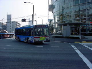 陸橋を渡りえ終えると大崎駅です。バス停付近には、大崎駅と大崎ゲートシティを結ぶ歩道橋が見えます。 |
