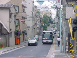 踏切を渡ろうとしている渋72です。画像奥にバス停がありますが、その目の前に桐が谷火葬場があります。この道は、大型車が走っていた一時期「一方通行」となり渋谷方面のみ通過となっていました。昭和55年3月に中型車化され、両方通行できるようになり現在の姿となっています。 |