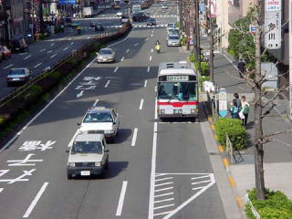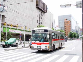 | こちらは、渋谷方向のバス停です。左手には、TOC(東京卸売センター)があります。TOCの契約輸送のバスは、敷地内で折り返します。 |