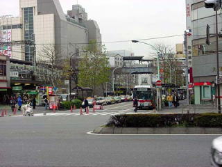 終点五反田駅です。全線乗車お疲れ様です。 後ろは、池上線、左は山手線の五反田駅です。 見にくいかも知れませんがバス停のあたりの道路には、まだセンターラインのところにガードレールがありません。その頃は、タクシー乗り場からの撮影も容易でした。 |