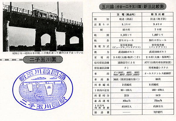 玉電廃止後の7年のち昭和52年4月7日に、玉電は新玉川線として生まれ変わりました。当初予定の建設費の10倍とも言われる727億円の巨費を投じ完成しました。その理由としては、当初高架で建設する予定だったものが地下鉄として建設することになったからといわれています。ノロ電と揶揄されていた玉電も高速鉄道として生まれ変わりました。右のスタンプ帳の一番うしろには、玉川線と新玉川線の比較がありますが、所要時間が32分から14分に短縮されています。